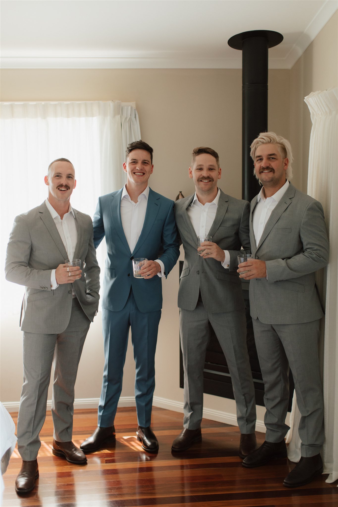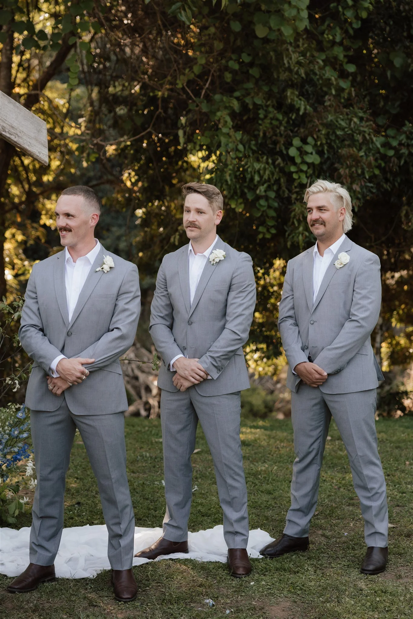 Connor wore a dusty blue suit that complemented the palette of the bridal party — muted shades of cornflower, slate, and sky dancing subtly through the bridesmaids’ dresses. Together, the couple struck a picture of understated sophistication with a hint of retro flair.